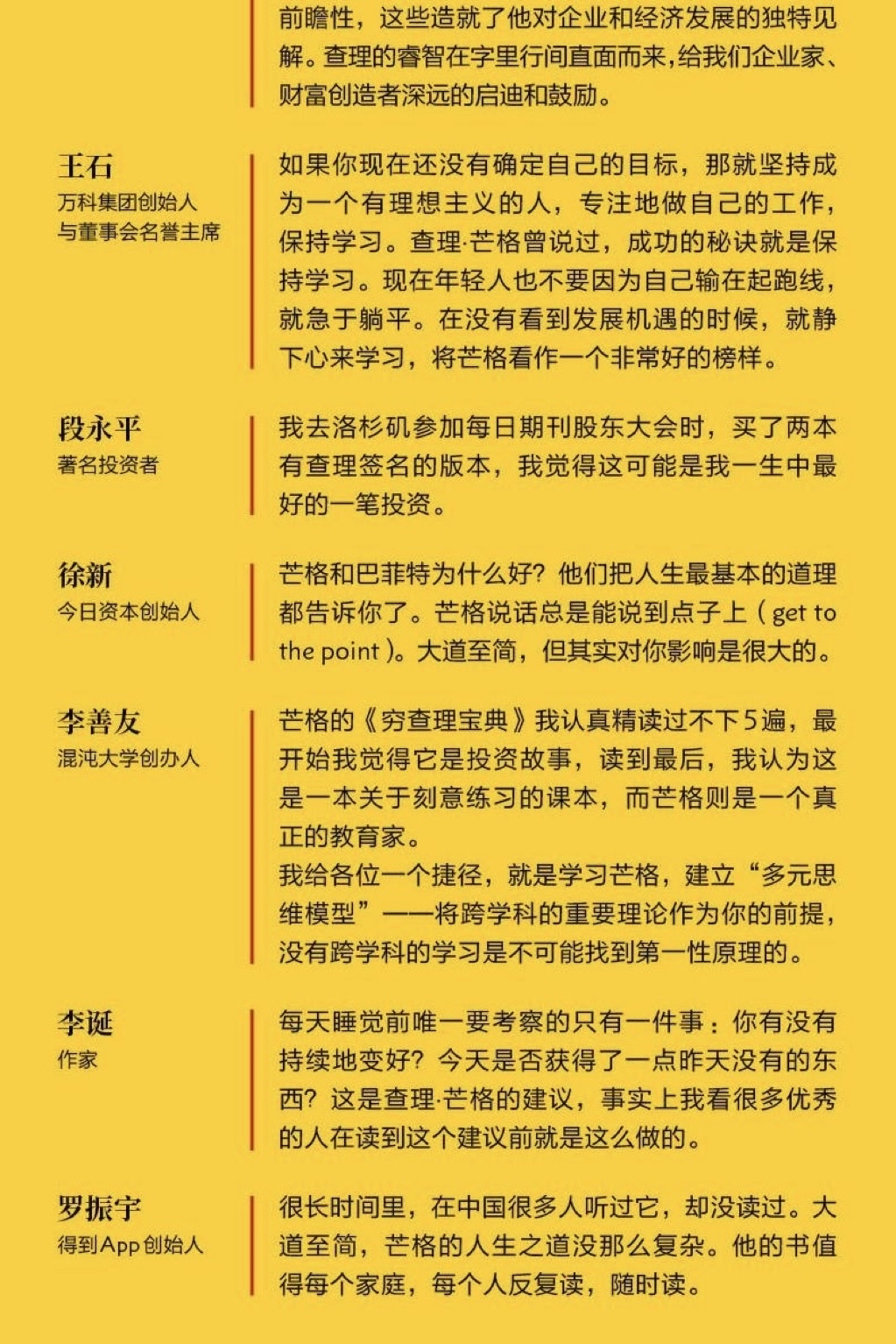 芒格的智慧又远不止于投资,构成本书重头的查理十一讲,忠实呈现了芒格是如何用广博学习的方式思考和理解现实世界的。这也是他与巴菲特相比显著不同的特点,芒格对这个世界运转的规律有探索的热情。其中有他提给年轻人的人生建议,有他对投资实践的评断,有他对可口可乐生意作出的商业分析,有他独创的多元思维模型,以及他总结提炼的人类误判心理学。