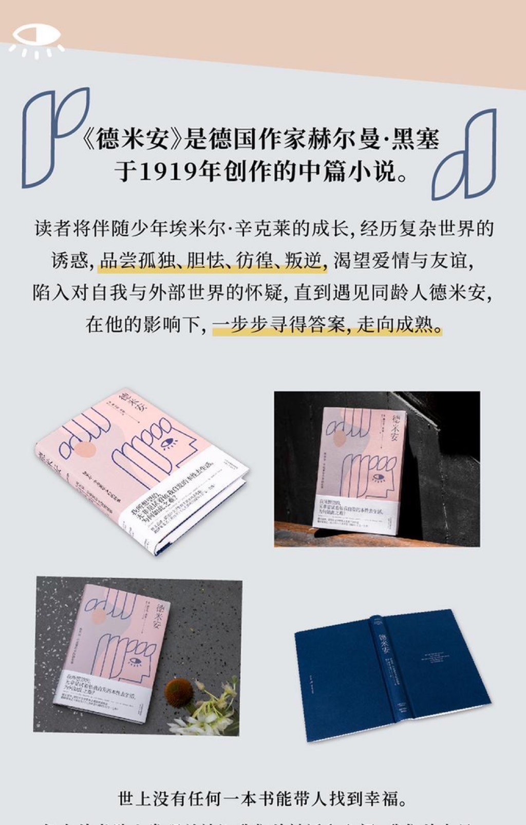 《德米安》是黑塞的代表作之一,以抒情的笔调、细腻的文字描写少年辛克莱追寻自我、坚定地成为自己、探索自我命运的心路历程。这部心理小说可以说是黑塞标志性的、纪念碑式的名作。
