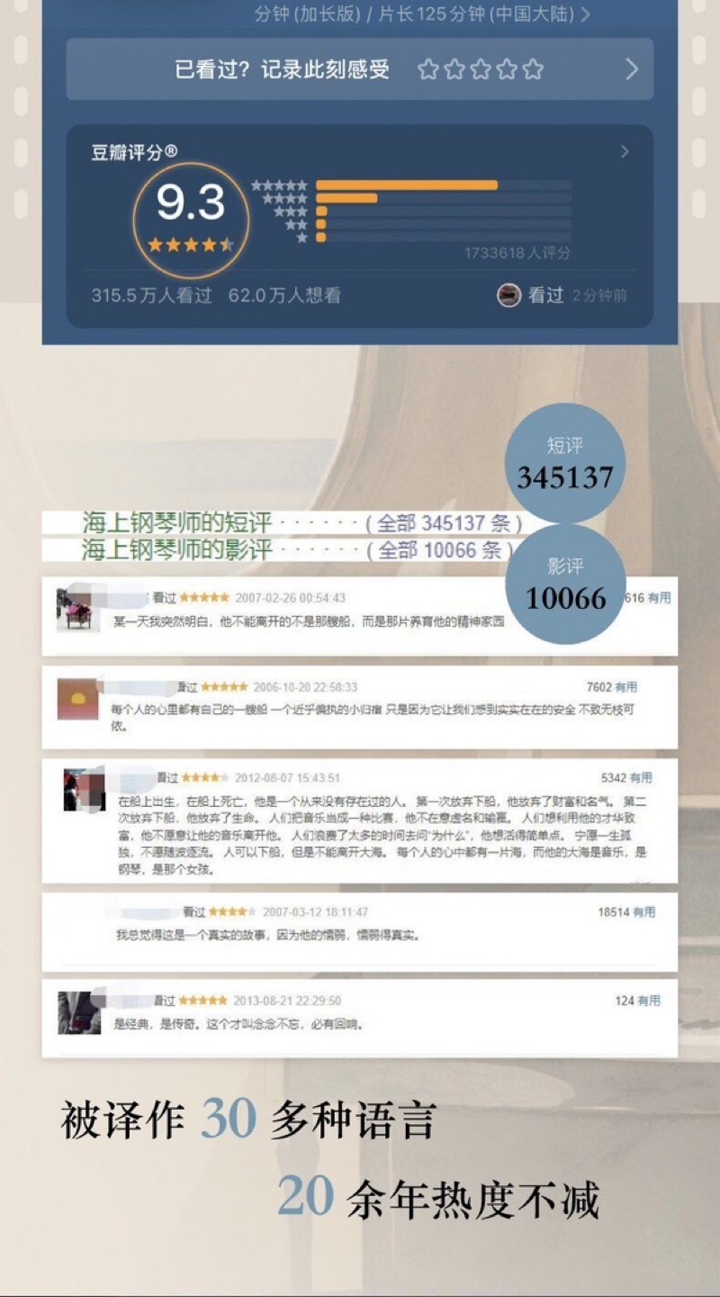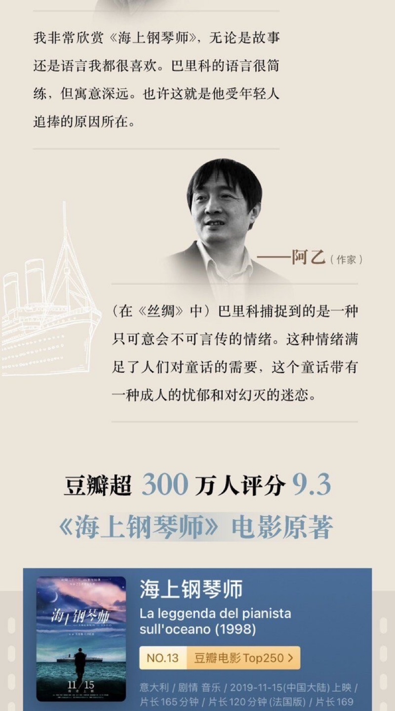 我非常欣赏《海上钢琴师》,无论是故事还是语言我都很喜欢。巴里科的语言很简练,但寓意深远。也许这就是他受年轻人追捧的原因所在。——朱塞佩 · 托纳多雷(《海上钢琴师》电影导演)