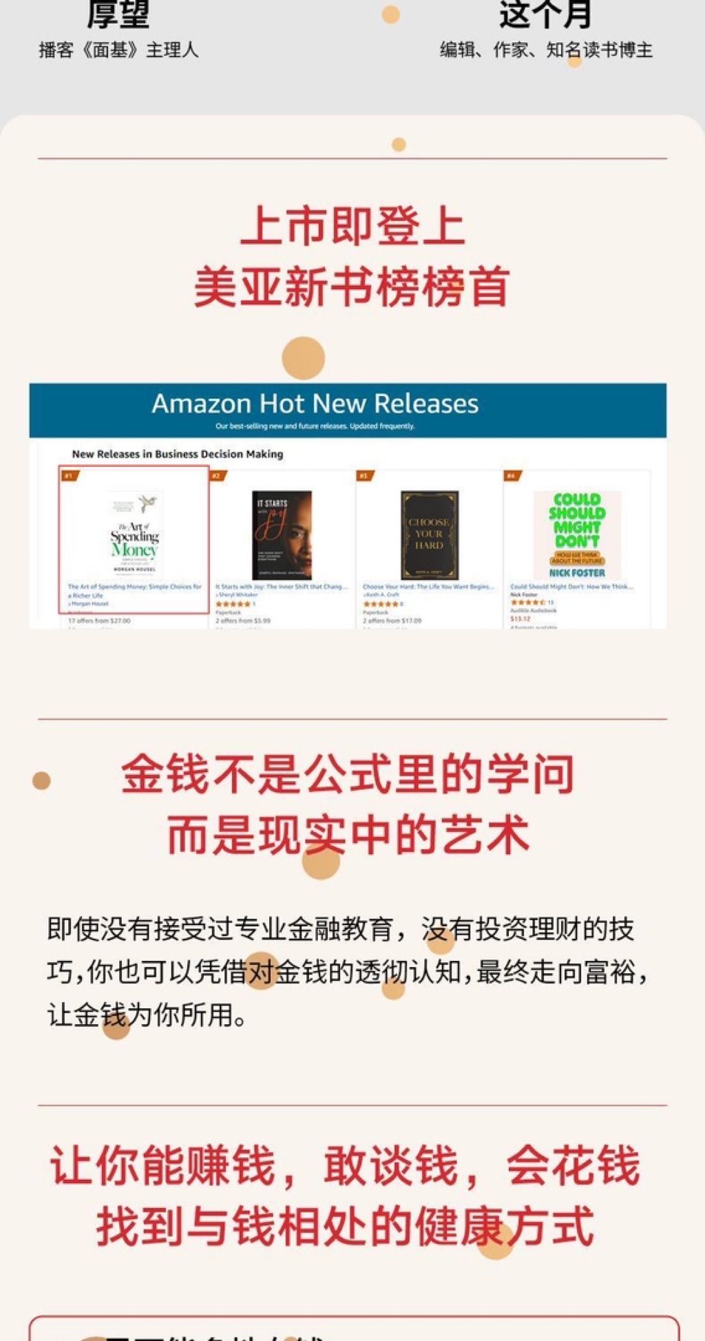 时隔多年,摩根·豪泽尔又回归到自己最擅长的财富、人性和幸福话题。他在书中横跨心理学、投资、历史等多视角,以案例故事的讲述方式,为我们娓娓道来了20个关于金钱的智慧。