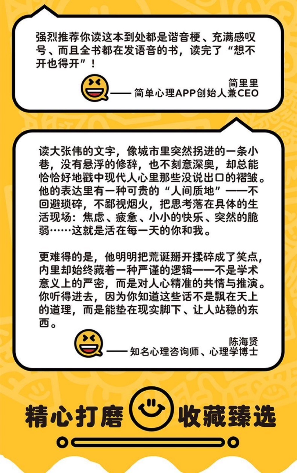 更难得的是,他明明把荒诞掰开揉碎成了笑点,内里却始终藏着一种严谨的逻辑——不是学术意义上的严密,而是对人心精准的共情与推演。你听得进去,因为你知道这些话不是飘在天上的道理,而是能垫在现实脚下、让人站稳的东西。——陈海贤(知名心理咨询师、心理学博士)