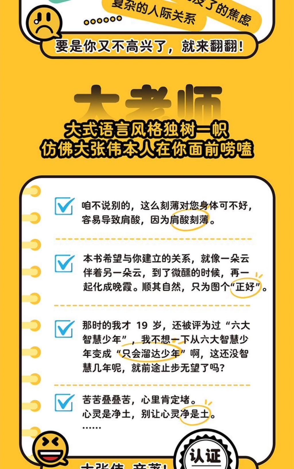 大张伟亲著个人作品集,一本企图疗愈你的不开心、放大快乐的自洽手册。大老师用他专属的大式幽默,专治各种纠结、内耗和自我较劲,带你找到属于自己的光。