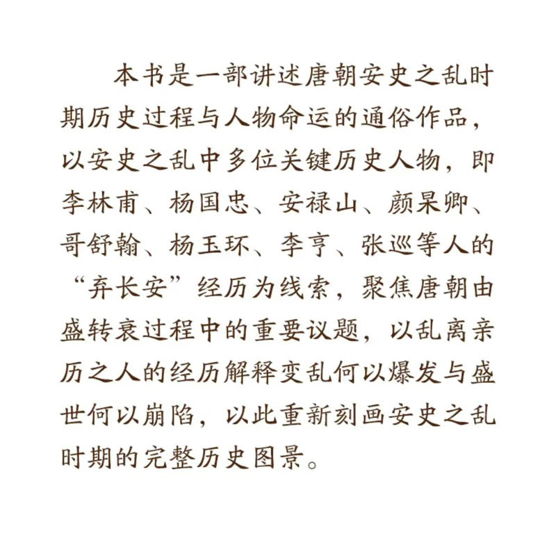 本书是一部讲述唐朝安史之乱时期历史过程与人物命运的通俗作品,以安史之乱中多位关键历史人物,即李林甫、杨国忠、安禄山、颜杲卿、哥舒翰、杨玉环、李亨、张巡等人的“弃长安”经历为线索,聚焦唐朝由盛转衰过程中的重要议题,以乱离亲历之人的经历解释变乱何以爆发与盛世何以崩陷,以此重新刻画安史之乱时期的完整历史图景。